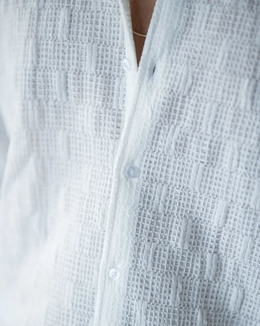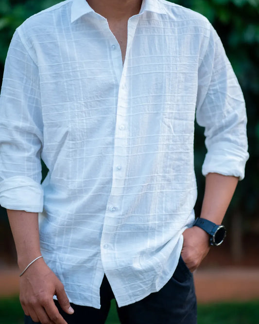 Men's White Textured Linen Long Sleeve Button-Down Shirt, Slim Fit, Collared, LLY Shirt